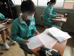 図書室をのぞいてみると、3名の1年生図書委員が、本の帯を取り外し、余分なところを切り取る作業をやっていました。委員会の仕事をしっかりやっている1年生でした。