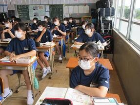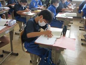 今日の5、6校時に2年生が、DVDで戦争体験講話を視聴しました。昨年度はオンライン、今年度はDVDでの実施となっていますが、実際に体験した方の話は生徒たちの心に響いたようでした。視聴後、ふりかえりを書いていましたが、なかなかいい内容の事が書かれていました。