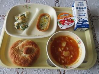 今日の給食は、米粉パン、牛乳、野菜グラタン、コールスローサラダ、ミネストローネ、アセロラゼリーです。高根沢町で生産されたものは、大豆、にんじん、大根、玉ねぎ、キャベツ、きゅうり、じゃがいもです。今日もたいへんおいしく頂きました。