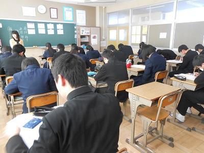 さて、今日で3年生の授業は終了となります。3年生は各教科の学習内容が終了し、明日の受検に向けて問題に必死に取り組んでいました。中には面接での回答について練習している生徒もいました。明日は自信を持って入試に臨んでほしいです。