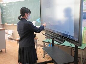 三角形の合同の証明する問題を解いていました。電子黒板が効果的に使われていました。