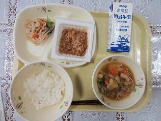 今日の給食は、ご飯、牛乳、納豆、肉じゃが、切干大根とツナの和え物です。高根沢町で生産されたものは、にんじん、玉ねぎ、米です。今日もたいへんおいしく頂きました。