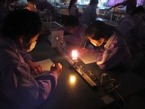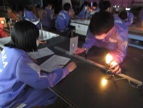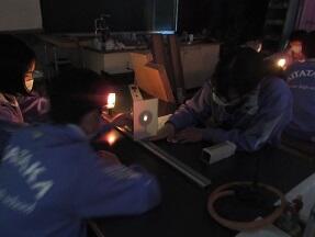凸レンズを通ると光はどうなるかを確かめる実験を行っていました。どのグループも協力して実験を進めていました。