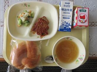 今日の給食は、クリスマスメニューで、米粉パン、牛乳、ハンバーグデミグラスソース、ブロッコリーとチーズのサラダ、オニオンスープ、クリスマスセレクトデザートです。高根沢町で生産されたものは、トマト、玉ねぎ、にんじんです。今日もたいへんおいしく頂きました。