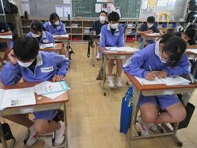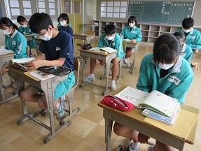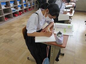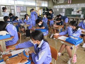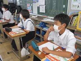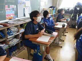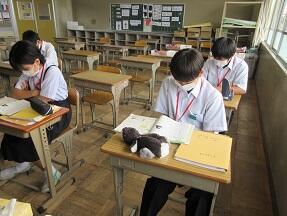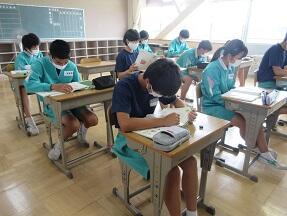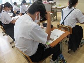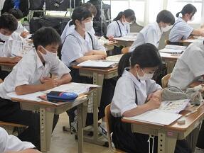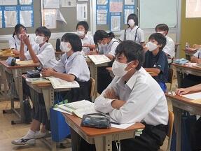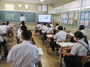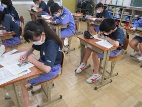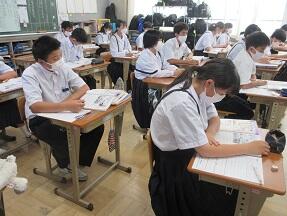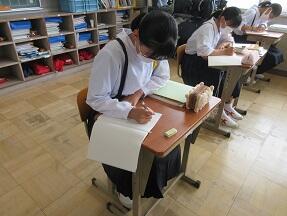 今日の5、6校時に2年生が、DVDで戦争体験講話を視聴しました。昨年度はオンライン、今年度はDVDでの実施となっていますが、実際に体験した方の話は生徒たちの心に響いたようでした。視聴後、ふりかえりを書いていましたが、なかなかいい内容の事が書かれていました。