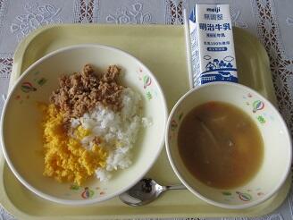 今日の給食は、二色丼(ご飯・大豆入り鶏そぼろ・卵そぼろ)、牛乳、けんちん汁です。高根沢町で生産されたものは、豆腐、味噌、にんじん、大根、ねぎ、米です。今日もたいへんおいしく頂きました。