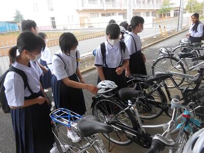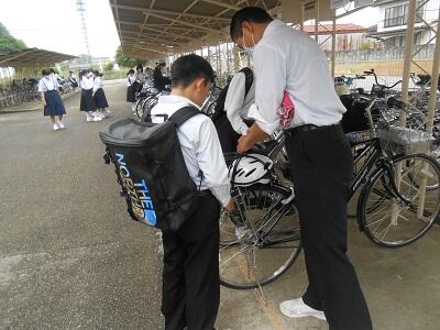 【ヘルメットの縛り方】生徒会役員が1年生に直接、ヘルメットを自転車に取り付ける方法を指導してくれました。先輩が後輩へ優しく教えてあげ、1年生が「ありがとうございます」と感謝の言葉を述べていました。微笑ましい光景でした。