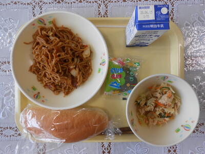 【給食メニュー】コッペパン、いか焼きそば、棒々鶏サラダ、かしわ餅です。今日はかみかみメニューです。食事はよくかんで食べましょう。