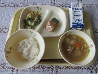 今日の給食は、ご飯、牛乳、さば味噌煮、干ぴょうのごま酢和え、ピリ辛味噌汁です。高根沢町で生産された物は、味噌、ねぎ、きゅうり、米です。今日もたいへんおいしく頂きました。