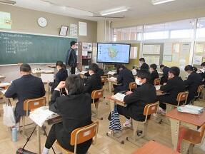 北アメリカ州の自然環境について学習していました。電子黒板が効果的に使われていました。