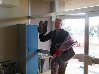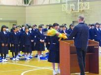 ●生徒とのお別れ会は昨日行いました。今日のお昼休みには、職員室で職員とのお別れ会を行いました。 職員からの記念品として「花束」をお贈りしました。マイケル先生からは、日本語で、「1年間、お世話になりました。」という内容の話がありました。マイケル先生は、近日中にアメリカに帰国し、新たな仕事に就くと言うことです。