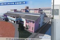 〇東小と北中の完成校舎の色が変化!?・・・・・・今日の午前中、工事現場北西のフェンスに掲げてあった「東小・北中校舎の完成図(鳥瞰図)」の取り替え工事をしていました。