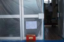 (校舎壁塗装のために窓ガラス免に半透明シートがかけられました)