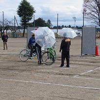 ●交通違反(一時停止無視や右側通行、ながら運転、傘をしての運転など)の自転車が車と接触する演習では、スタントマンが車にぶつかったり、ボンネットに乗ってしまうような演習を見ることができました。