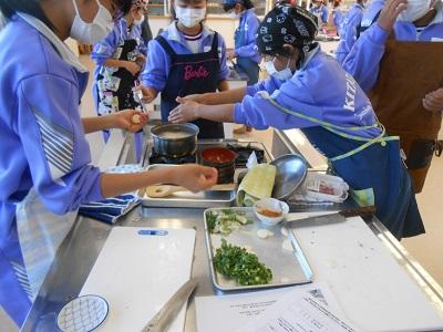 今日は1時間目から家庭科の授業で1年3組が「調理実習」を行っていました。ねらいは「最高に美味しい、さつま汁ときゅうりの塩こんぶ和えをつくろう」です。慣れない手つきで肉や野菜を切っていました。「家でもやるの?」と聞いてみたら「あんまり~」と言っていました。今日の献立を家でつくって、保護者に食べてもらうことを宿題にしたいですね。
