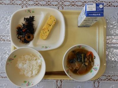 【給食メニュー】 ひじき炒り煮と根菜のごま汁、野菜卵焼きです。