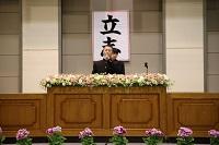 二年生の皆さん、立志の日を迎えることができたこと、本当におめでとうございます。皆さんの胸中は、きっと夢の実現に向かって邁進していくんだとういう気概に満ちあふれているのではないかと思います。今日はまさに人生の記念日、そして新たなスタートの日です。スタートラインに立った皆さんには、これからも無限の可能性があります。そのような中で皆さんに求められるのは、未知の分野へのチャレンジです。自由な発想で様々な課題を発見し、解決していく能力と、その結果に責任を持つことです。この可能性と時間を有効に活かせるかどうかは、皆さんのこれからの努力と研鑚にかかっているのです。