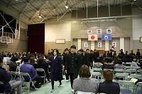 今年度最後の「全校朝会」が行われました。時間に遅れず、整然と静かに待つ姿に今年1年間の成長を感じました。理科展や校内書き初め展等の表彰の後、福祉委員会から「一日一善運動」の表彰がありました。最後に生徒には「健康な生活と1年間の締めくくり」として思いを伝えました。