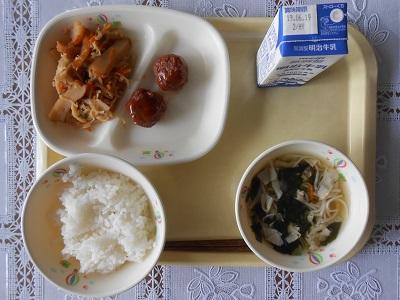 【給食メニュー】 野菜肉団子、切り干し大根の煮物、湯葉とほうれん草のスープです。