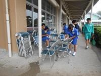 朝から強い雨が降り続いています。しかし、生徒はレインコートを着用し、靴をぬらしながら元気に登校してくれました。士気高まる生徒をおさめるかのようなこの雨は、午後予定されている準備も予定どおりに進まない状況です(当日の朝に準備予定)。