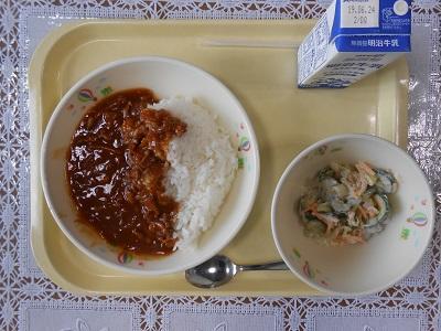 【給食メニュー】 チキンカレーとひじきのサラダです。カレーは全員完食のようです。