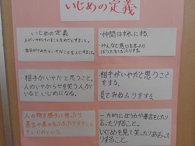 【校内散策】 1年生の廊下に「いじめの定義」という授業で活用したものが掲示されていました。全国では多くの児童生徒が「いじめ」を受けて、尊い命を失ったり、悩んでいたりしています。本校から「いじめ」が発生しないよう日頃から気を付けていきたいです。