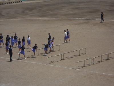 1年1・2組「保健体育」陸上競技の授業です。男女に分かれ男子が「ハードル」女子が「走り幅跳び」を学習しています。教育実習生が「ハードル」の指導をしています。見事なハードリングです。