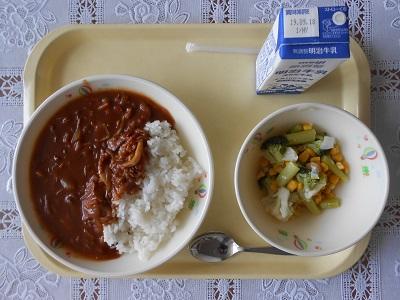 【給食メニュー】 ハッシュドポークカレー、コーン入りサラダです。