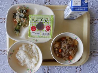 【給食メニュー】 牛肉のうま煮、雑魚とエビのサラダ、冷ややっこです。牛肉とじゃが芋がたくさん入っていました。とても美味しかったです。