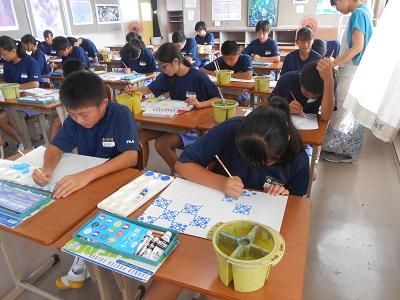 【授業の様子】 2年2組「美術」、デザインです。細かい部分を丁寧に着色していました。