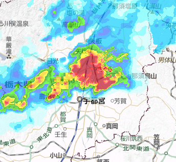 高根沢町上空に雨雲が発生しています。予報では1時間程度は続く予報です。