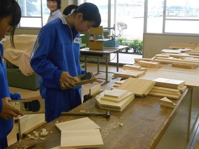 1年1組「技術」、木材加工です。なかなかのこぎりが上手に使えないようです。筋力が必要です。
