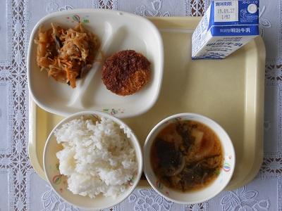 【給食メニュー】 チキンミントカツ、切り干し大根の煮物、じゃが芋とわかめの味噌汁です。