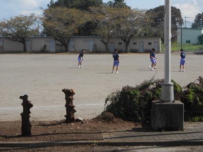 男子は校庭でソフトボールを行っていました。柔らかいボールを使用し、素手できちんとキャッチできることを学んでいました。