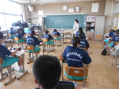 【授業参観】1年1組、1年生は3クラスとも中学校での学習について学んでいました。静かによく話を聞いていました。