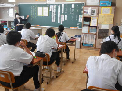 【授業参観】3年1組「国語」教育実習生も授業になれてきました。掲示物を作成し、生徒がわかりやすいように工夫しています。