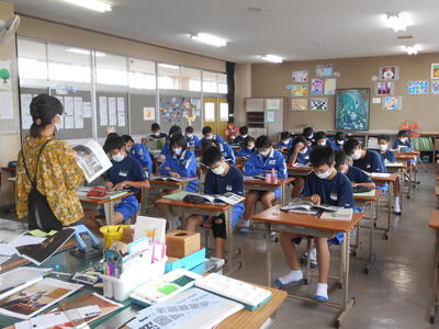 1年2組「美術」スケッチブックの表紙に、自分の名前をレタリングし染色していました。誰もが集中して静かに取り組んでいました。