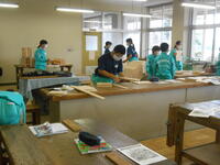 1年3組「技術」木材加工でいよいよ材料を刻んでいます。のこぎりでまっすぐ切るのは至難の業のようです。