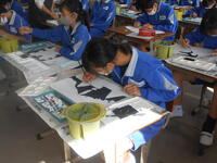 2年1組「美術」デザイン画の彩色です。細かな部分を丁寧に塗っていました。完成が楽しみです。