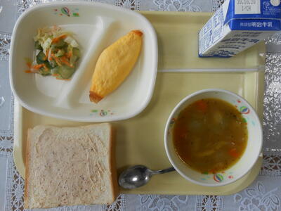 【給食メニュー】食パン、牛乳、チーズオムレツ、フレンチサラダ、マカロニカレースープです。食パンがとても厚く、レーズンクリームで美味しくいただきました。ごちそうさまでした。