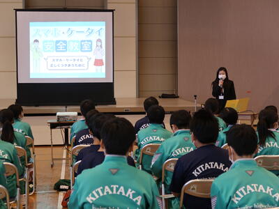【人権教室】1年生対象に「人権教室」を行いました。はじめにスマホ・携帯の安全な使い方を説明いただき、最後に人権擁護員の方からお話しをいただきました。いじめや誹謗中傷等が多い世の中ですが、本校ではいじめのない学校生活を送ってほしいです。