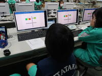 2年2組「技術」ソーラーラジオの作製です。ハンダ小手を使って接続するのが難しいようです。