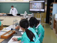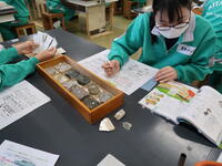 1年2組「理科」火成岩をつくる鉱物について実際に顕微鏡で確認していました。
