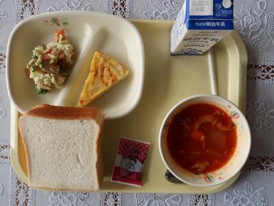 【給食メニュー】食パン、牛乳、アンサンブルエッグ、アーモンドとブロッコリーのサラダ、ポークビーンズです。サラダの中にアーモンドが細かく刻まれ、カリッとした食感が美味しさを増してくれました。アーモンドなどのナッツ類は体や脳の老化を防ぐビタミンEが多く含まれているそうです。ごちそうさまでした。