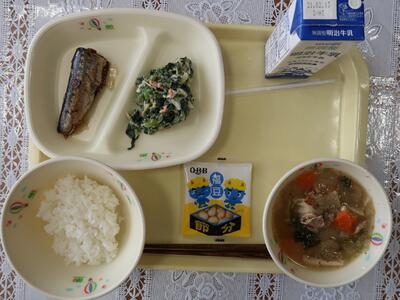 【給食メニュー】ご飯、牛乳、いわしの梅煮、春菊のツナ和え、根菜のごま汁、福豆の節分メニューです。いわしはとても柔らかく煮込んでいて、骨まで全部食べることができました。ごちそうさまでした。