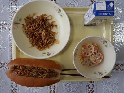 【給食メニュー】焼きそばパン、牛乳、レンコンサラダです。レンコンは、はすの地下茎で、主成分は炭水化物ですが、そのほかにもビタミン、ミネラル、食物繊維やポリフェノールなど、いくつもの栄養素を豊富に含んでいる栄養価が高い食物です。ごちそうさまでした。