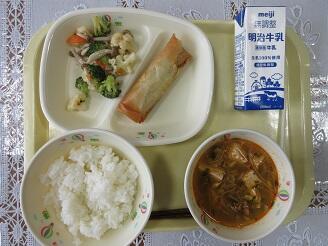 今日の給食は、ご飯、牛乳、春巻、ブロッコリーとしめじのサラダ、キムチスープです。高根沢町で生産されたものは、豆腐、味噌、米です。今日もたいへんおいしく頂きました。