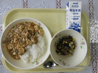 今日の給食は、マーボー丼(ご飯・マーボー丼の具)、牛乳、こんにゃく海藻サラダです。高根沢町で生産されたものは、豆腐、味噌、米です。今日もたいへんおいしく頂きました。