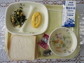 今日の給食は、食パン、チョコクリーム(マーシャルビーンズ)、牛乳、トマトオムレツ、こんにゃく海そうサラダ、白いんげん豆のポタージュです。高根沢町で生産されたものは、にんじん、キャベツ、玉ねぎ、きゅうりです。今日もたいへんおいしく頂きました。
