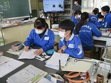 マグネシウムと亜鉛ではどちらが陽イオンになりやすいかをプリントでまとめています。実験がうまく進んだようでまとめがスムーズに進んでいるように見えます。
